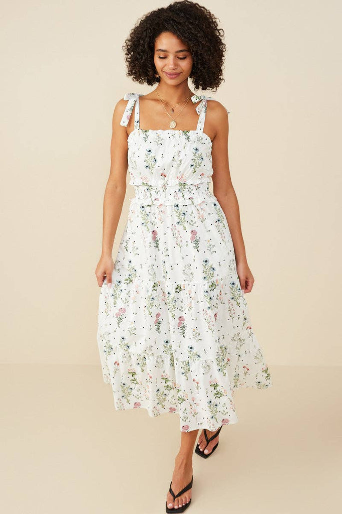 This dress features a floral woven fabric with a smoked waist and tie shoulder straps.