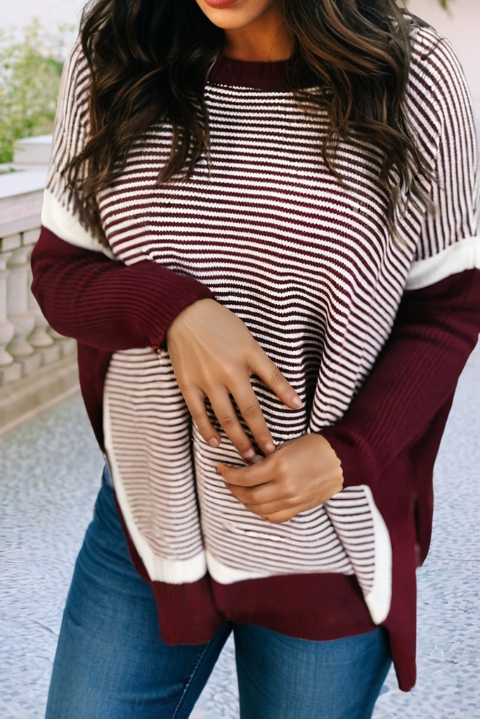 Bold color blocks make a statement. Artistic patchwork design stands out. Flowy dolman sleeves offer relaxed elegance.